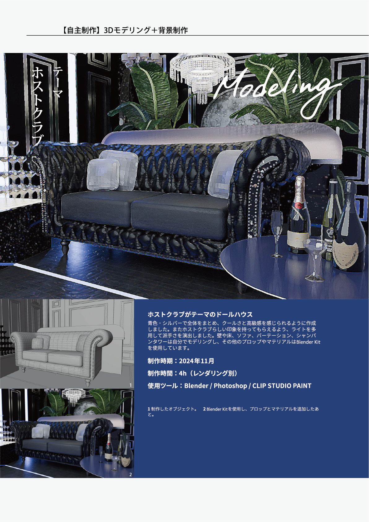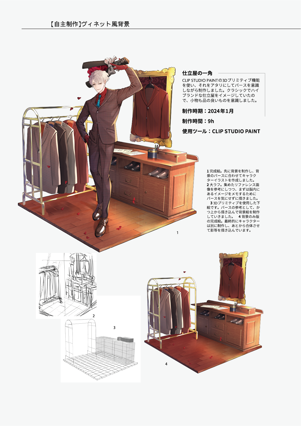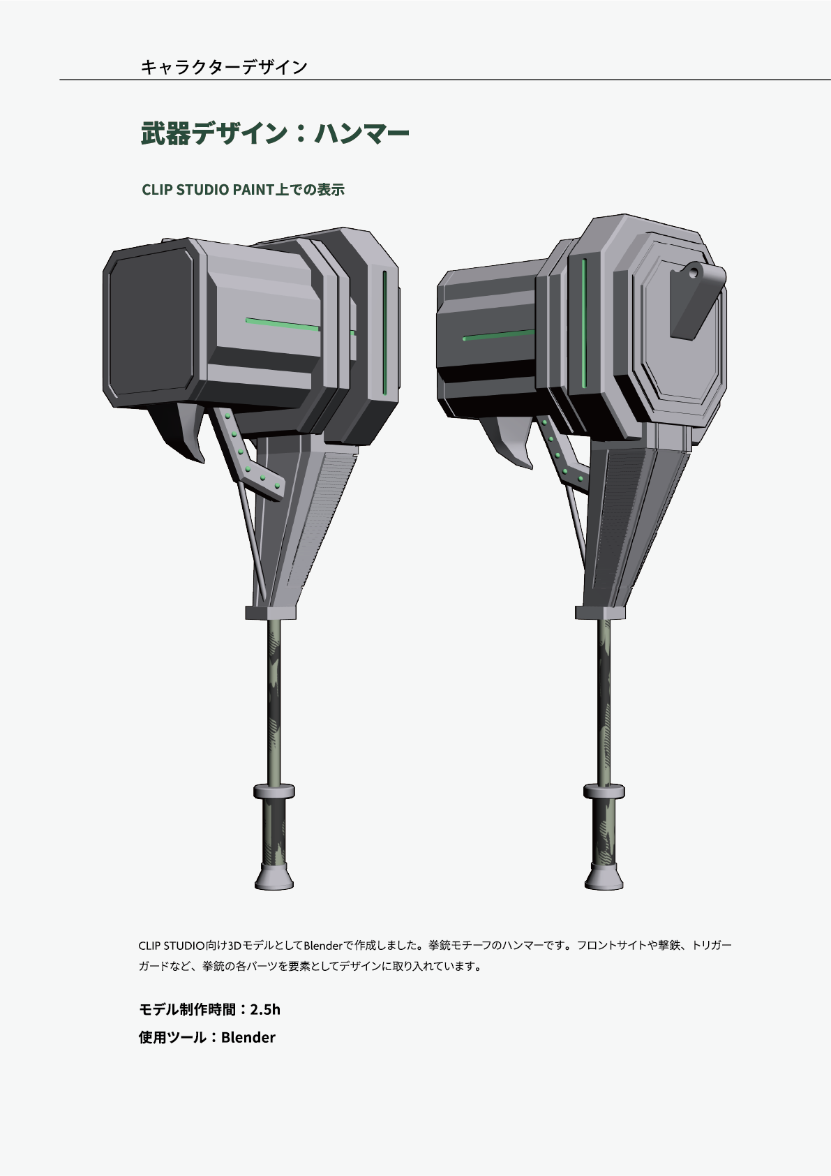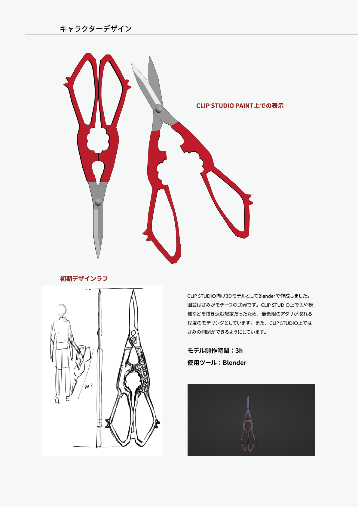 Skils 使用可能なツールやスキルです。 CLIP STUDIO PAINT EX版を約10年使用。イラスト制作・漫画制作における基本的な操作が可能。3Dモデルの導入・使用も可能です。 Blender 人工物のモデリング、アドオンの導入・使用が可能です。基本的なレンダリング・モデルのエクスポートも可能です。その他、簡易的なモデルのUV展開やシェーダーエディターを扱うことができます。 CLIP STUDIO PAINT向けの3Dモデルの作成をしています。 CLIP STUDIO MODELER ツールを使用し、作成した3DモデルをCLIP STUDIO PAINT用3D素材としてセットアップできます。 Photoshop/Illustrator Photoshopでは色調補正やパスの切り抜き、解像度の変更、画像の出力など基本的な処理を行えます。Illustratorでは図形の作成や簡単な文字組など、基本的な内容を行えます。 Live2D Cubism イラストからLive2D向けへのパーツ分け、イラストへの簡易的な動き付け、簡易的なLive2Dモデルの作成(パーツ分け・モデリング)が可能です。 Premiere Pro/After Effects カット、簡単な画像、文字のエフェクト、音量調整ができます。 HTML Living Standard/CSS/SCSS/jQuery HTMLの主要なタグを理解し、デザインに合わせたマークアップをSEOの観点から正しくタグ付けできます。 CSSはレスポンシブ対応が可能です。SCSSは変数やネスト構造、mixin機能を使用した記述ができます。 jQueryはプラグインの実装が可能です。 Word/Excel/PowerPoint 基本的な操作は一通り可能です。ビジネス文書作成、リスト作成や関数(四則演算、VLOOKUP関数など)を使用した表の作成、企画提案のプレゼン資料の作成などができます。 企画提案/IP業務 コンシューマ向け製品の商品企画を5年経験。新規事業の創出や既存ラインナップの商品企画経験から、コンセプト設定から企画書の作成・プレゼンテーション、日程案の作成提案ができます。また、キャラクターIPのライセンス商品の商談・契約・企画の実務経験があります。知的財産、ライセンス契約、ロイヤリティ等の知識があります。